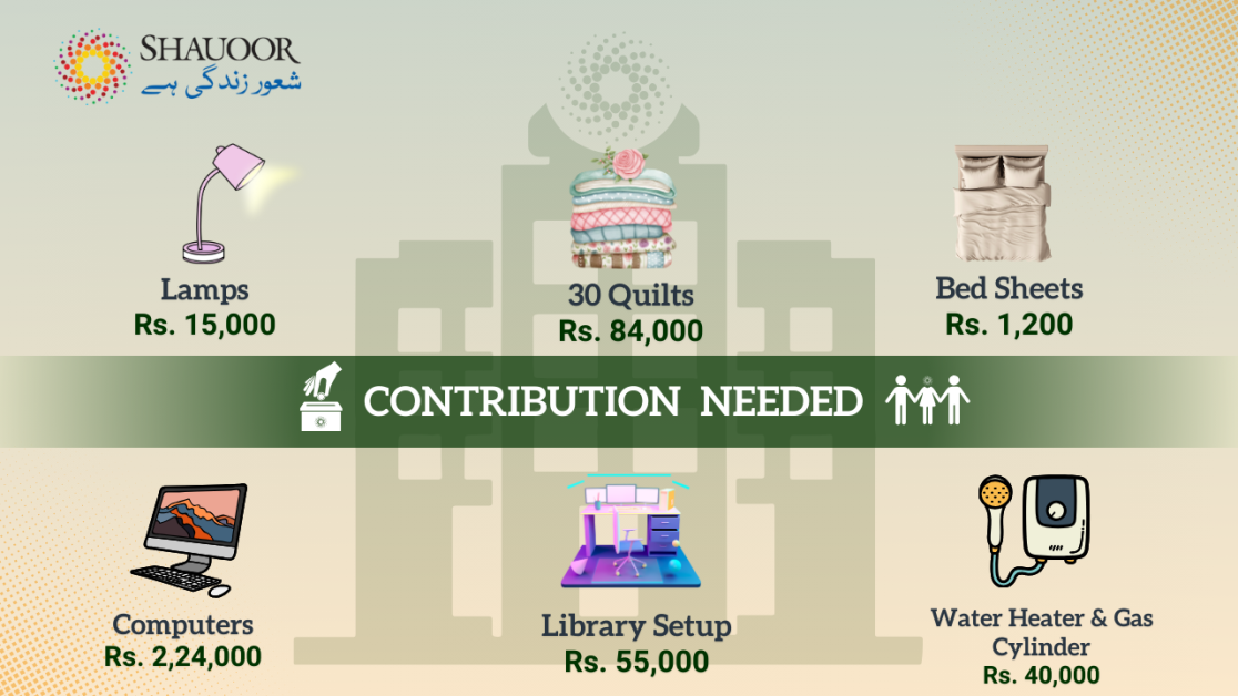 Support Shauoor Maan Ghar: Bringing Comfort and Educational Resources to Orphans and the helpless destitute. Maan Ghar, Shauoor’s orphanage and shelter home for women, needs basic accessories to welcome the upcoming winter season and learning resources for students living there. You can contribute by sponsoring any of the following: Quilts: We need 30 quilts at Rs. 2,800 each. Lamps: 6 rooms require lamps, each costing Rs. 2,500 . A Water Heater & Gas Cylinder: A unit costs Rs. 40,000. Computers: We need 8 computers for the students each for Rs. 28,000 . Library Setup: Cabinets will cost Rs. 40,000 and books Rs. 15,000. Bed Sheets: We need 30 bed sheets at Rs. 1,200 each. Your contribution in any one category will make a lasting impact. Please consider donating today.